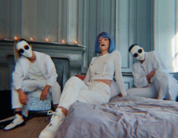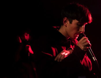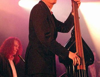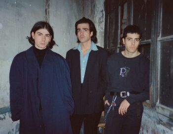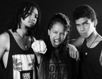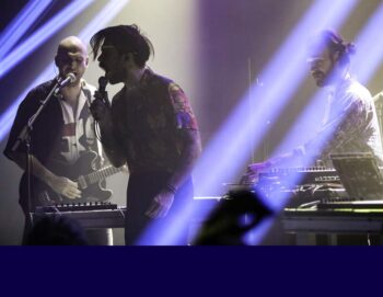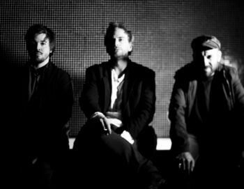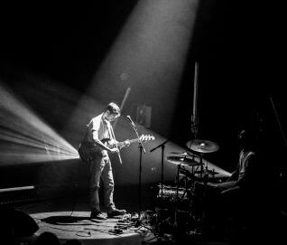Photo des 3 musiciens sur scène en clair obscur sur fond de lumière rouge